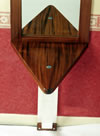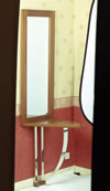 This Honduran mahogany triangular table with its highly polished stainless steel leg was originally the extension of the Chameleon Meeting Table. The juxtaposition of the straight vertical wall leg, with the gentle curve of the forward leg section, marry harmoniously with the slightly rounded triangular mahogany top, with its custom-built, flat headed engraved locking pin incrusted in the polished surface, attaches underneath the wall mounted mirror giving an elegant form to any environment.